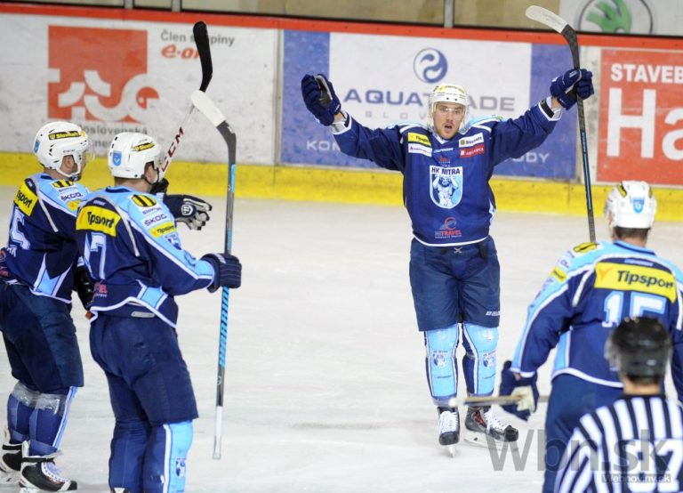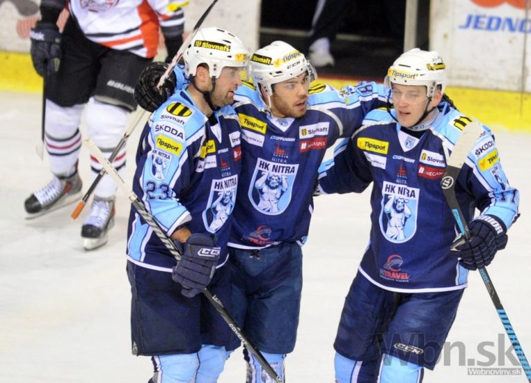 Marek Slovák (v strede), Tomáš Nádašdi (vľavo) a Peter Ordzovenský (vpravo) z HK Nitra počas 42. kola slovenskej hokejovej Tipsport extraligy 2014/2015 medzi HK Nitra - HC '05 Banská Bystrica. Nitra, 18. január 2015. Foto: SITA/Martin Havran