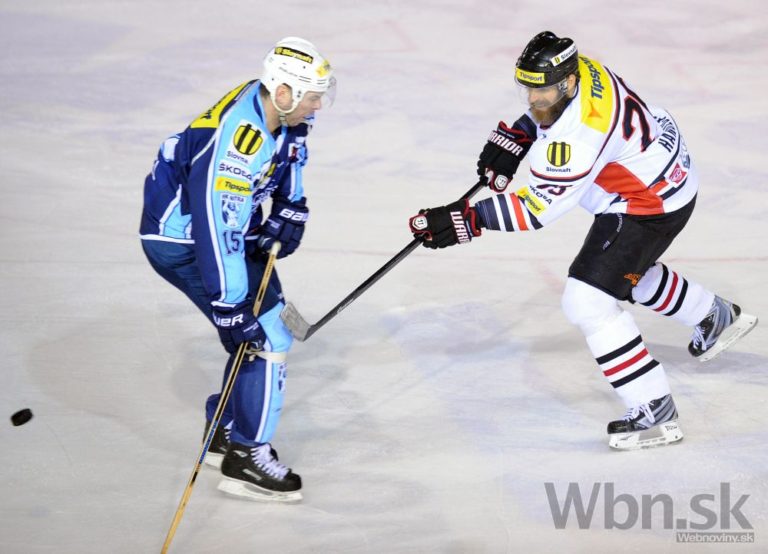 Jozef Stumpel z HK Nitra (vľavo) a Michal Handzuš z HC '05 Banská Bystrica (vpravo) počas 42. kola slovenskej hokejovej Tipsport extraligy 2014/2015 medzi HK Nitra - HC '05 Banská Bystrica. Nitra, 18. január 2015. Foto: SITA/Martin Havran
