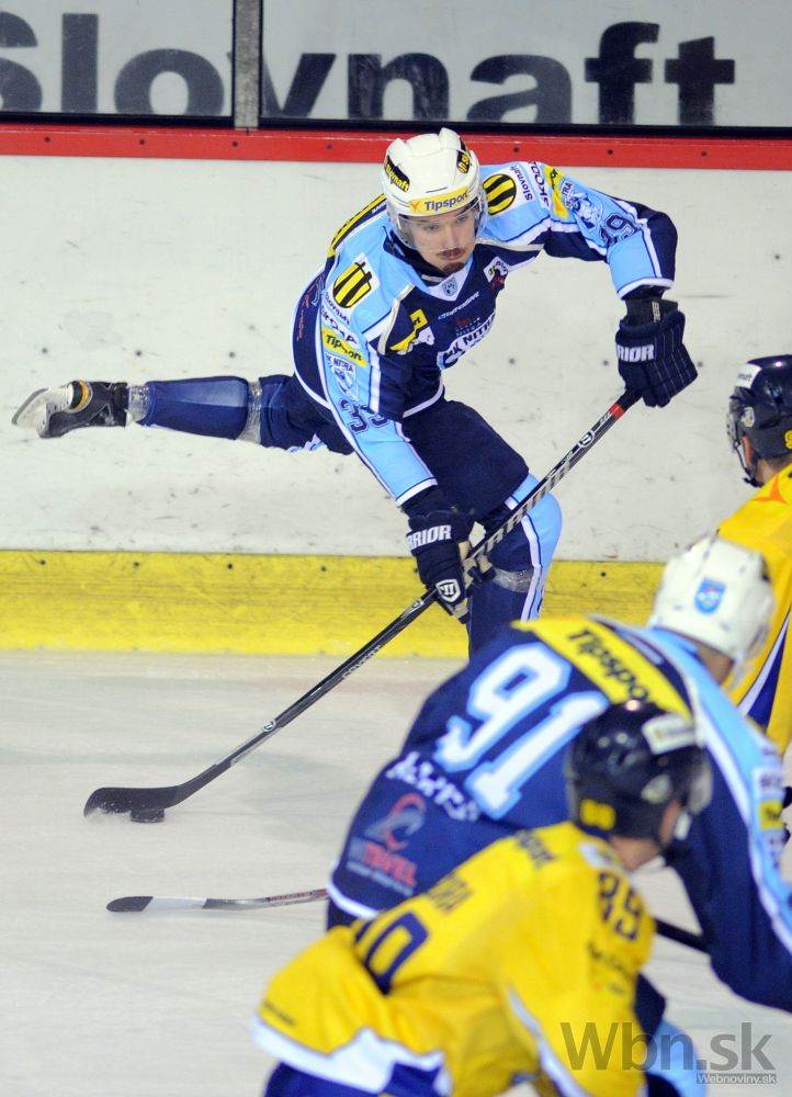 Edmund Piačka z HK Nitra (hore) počas 2. kola slovenskej hokejovej Tipsport extraligy 2014/2015 medzi HK Nitra - ŠHK 37 Piešťany. Nitra, 14. september 2014. Foto: SITA/Martin Havran