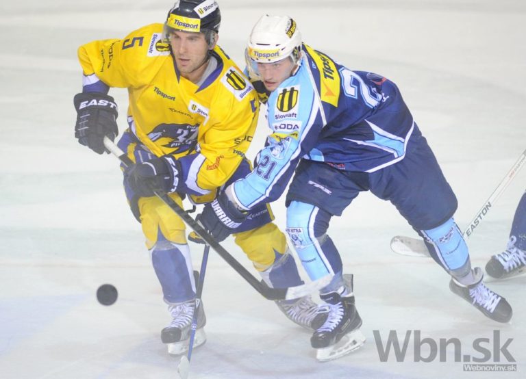 Marek Slovák z HK Nitra (vľavo) a Michal Vajlent z ŠHK 37 Piešťany (vpravo) počas 2. kola slovenskej hokejovej Tipsport extraligy 2014/2015 medzi HK Nitra - ŠHK 37 Piešťany. Nitra, 14. september 2014. Foto: SITA/Martin Havran