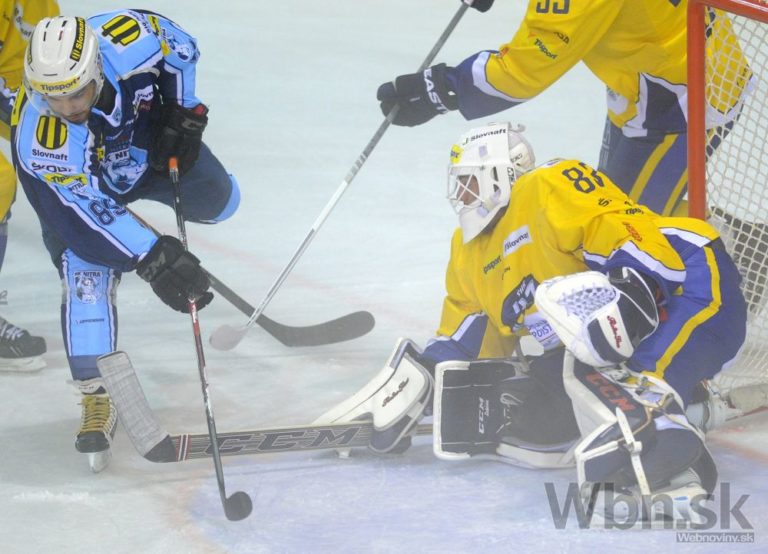 Marek Slovák z HK Nitra (vľavo) a brankár Martin Šúrek z ŠHK 37 Piešťany (vpravo) počas 2. kola slovenskej hokejovej Tipsport extraligy 2014/2015 medzi HK Nitra - ŠHK 37 Piešťany. Nitra, 14. september 2014. Foto: SITA/Martin Havran