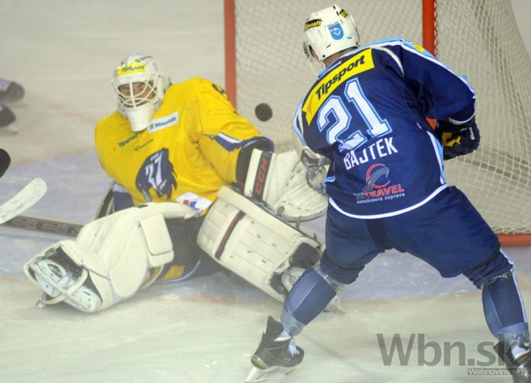 Filip Bajtek z HK Nitra (vpravo) a brankár Martin Šúrek z ŠHK 37 Piešťany (vľavo) počas 2. kola slovenskej hokejovej Tipsport extraligy 2014/2015 medzi HK Nitra - ŠHK 37 Piešťany. Nitra, 14. september 2014. Foto: SITA/Martin Havran
