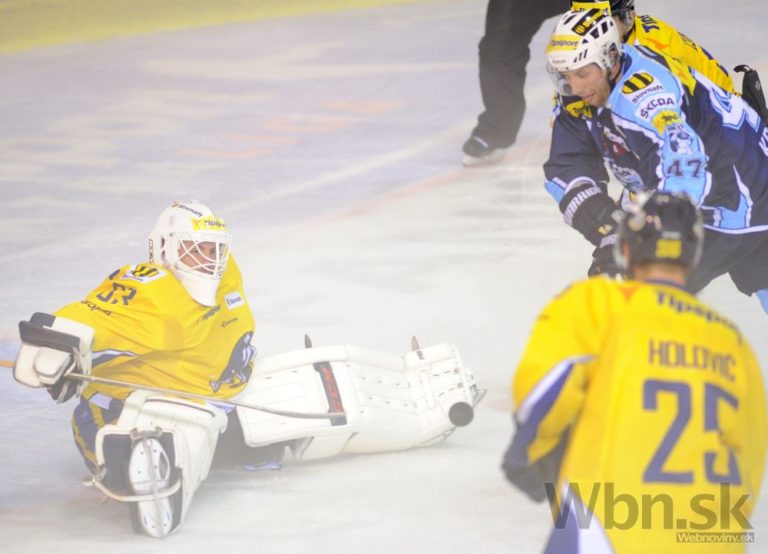 Miroslav Kováčik z HK Nitra (vpravo) a brankár Martin Šúrek z ŠHK 37 Piešťany (vľavo) počas 2. kola slovenskej hokejovej Tipsport extraligy 2014/2015 medzi HK Nitra - ŠHK 37 Piešťany. Nitra, 14. september 2014. Foto: SITA/Martin Havran