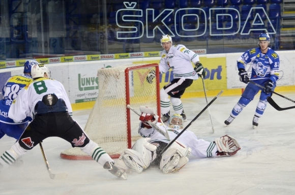 Súboj pred bránkou HK 36 Skalica počas hokejového zápasu 25. kola Tipsport extraligy 2013/2014 medzi HK Poprad - HK 36 Skalica. Poprad, 26. november 2013. Foto: SITA/Radoslav Maťaš