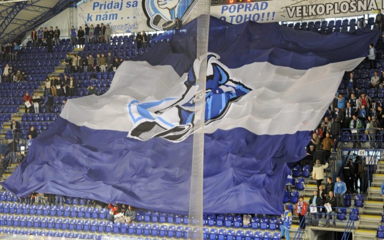 Fanúšikovia počas hokejového zápasu Slovnaft play-off Tipsport extraligy - štvrťfinále - tretí zápas, HK Poprad – ŠHK 37 Piešťany. Poprad, 14. marec 2014. Foto: SITA/Radoslav Maťaš
