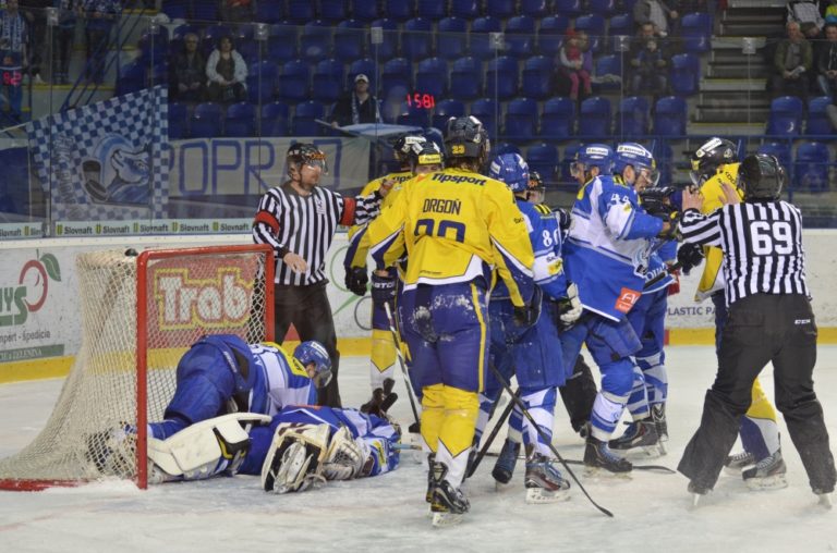 Zľava: Edgars Masalskis z HK Poprad a Patrik Lušňák z ŠHK 37 Piešťany počas hokejového zápasu Slovnaft play-off Tipsport extraligy - štvrťfinále - tretí zápas, HK Poprad – ŠHK 37 Piešťany. Poprad, 14. marec 2014. Foto: SITA/Radoslav Maťaš
