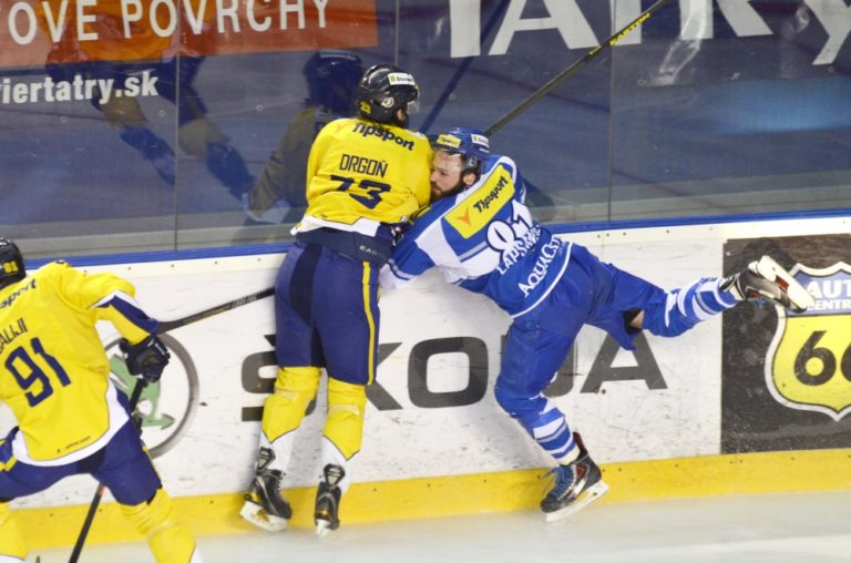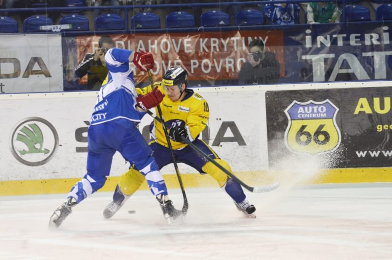 Zľava: Adam Lapšanský z HK Poprad a Matúš Rais z ŠHK 37 Piešťany počas hokejového Slovnaft play-off Tipsport extraligy - štvrťfinále - tretí zápas, HK Poprad – ŠHK 37 Piešťany. Poprad, 14. marec 2014. Foto: SITA/Radoslav Maťaš