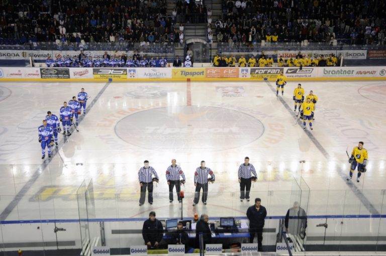 Mužstvá pred zápasom počas hokejového Slovnaft play-off Tipsport extraligy - štvrťfinále - tretí zápas, HK Poprad – ŠHK 37 Piešťany. Poprad, 14. marec 2014. Foto: SITA/Radoslav Maťaš