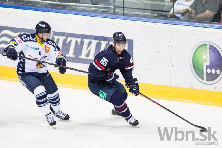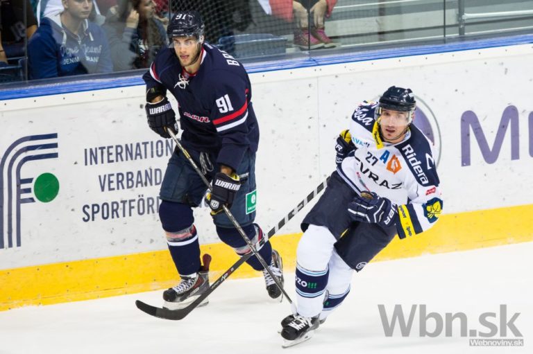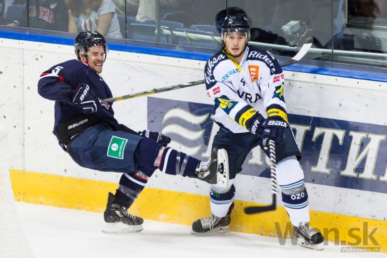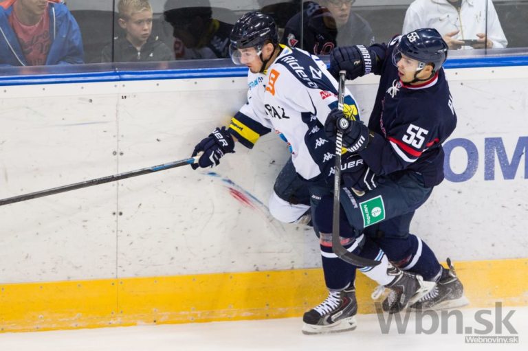 Sprava: Hráč Slovana Mário Bližňák a hráč Vítkovíc Michael Vandas počas prípravného hokejového zápasu medzi HC Slovan Bratislava - HC Vítkovice Steel. Bratislava, 28. august 2014. Foto: SITA/Jozef Jakubčo