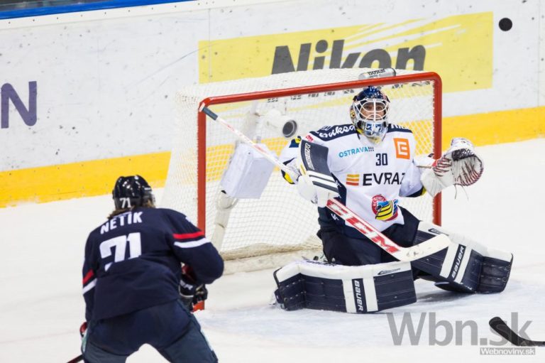Zľava: Hráč Slovana Tomáš Netík a brankár Vítkovíc Daniel Dolejš počas prípravného hokejového zápasu medzi HC Slovan Bratislava - HC Vítkovice Steel. Bratislava, 28. august 2014. Foto: SITA/Jozef Jakubčo