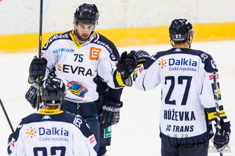 Sprava: Hráči Vítkovíc Jiří Burger, Petr Strapáč a Richard Stehlík počas prípravného hokejového zápasu medzi HC Slovan Bratislava - HC Vítkovice Steel. Bratislava, 28. august 2014. Foto: SITA/Jozef Jakubčo