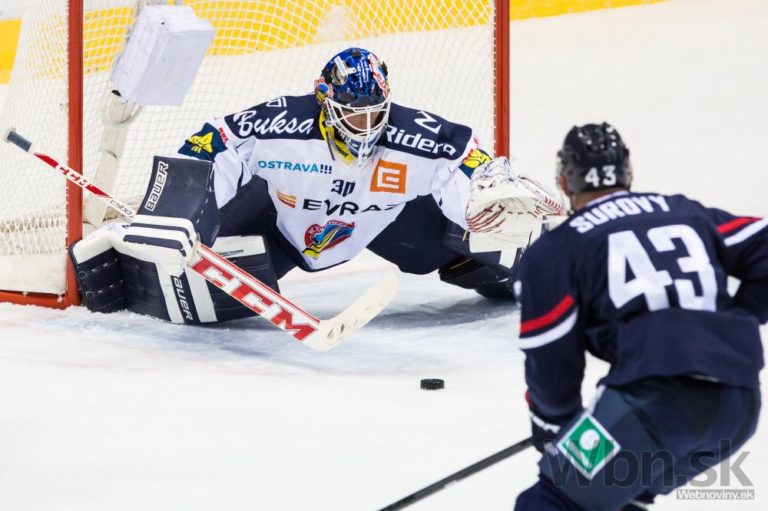 Sprava: Hráč Slovana Tomáš Surový a brankár Vítkovíc Daniel Dolejš počas prípravného hokejového zápasu medzi HC Slovan Bratislava - HC Vítkovice Steel. Bratislava, 28. august 2014. Foto: SITA/Jozef Jakubčo