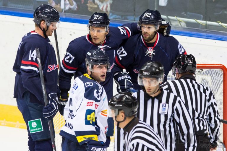 Zľava: Hráč Slovana Jonathan Sigalet a hráč Vítkovíc Petr Strapáč počas prípravného hokejového zápasu medzi HC Slovan Bratislava - HC Vítkovice Steel. Bratislava, 28. august 2014. Foto: SITA/Jozef Jakubčo