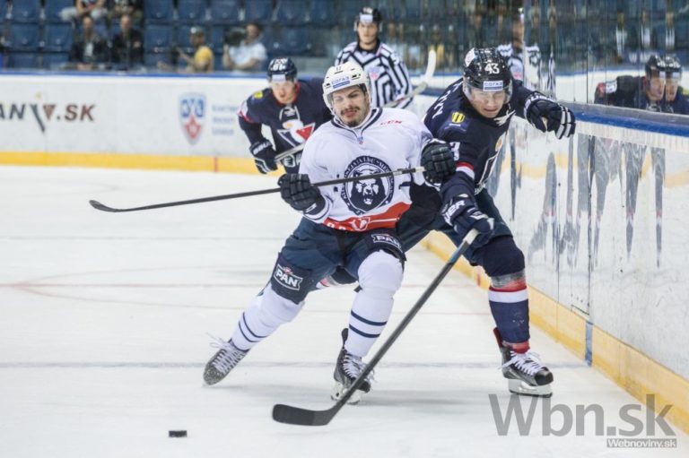 Zľava: Marek Viedenský zo Slovana a Mark Katic zo Záhrebu v zápase Kontinentálnej hokejovej ligy (KHL) medzi HC Slovan Bratislava - Medveščak Záhreb. Bratislava, 6. september 2015. Foto: SITA/Marko Erd