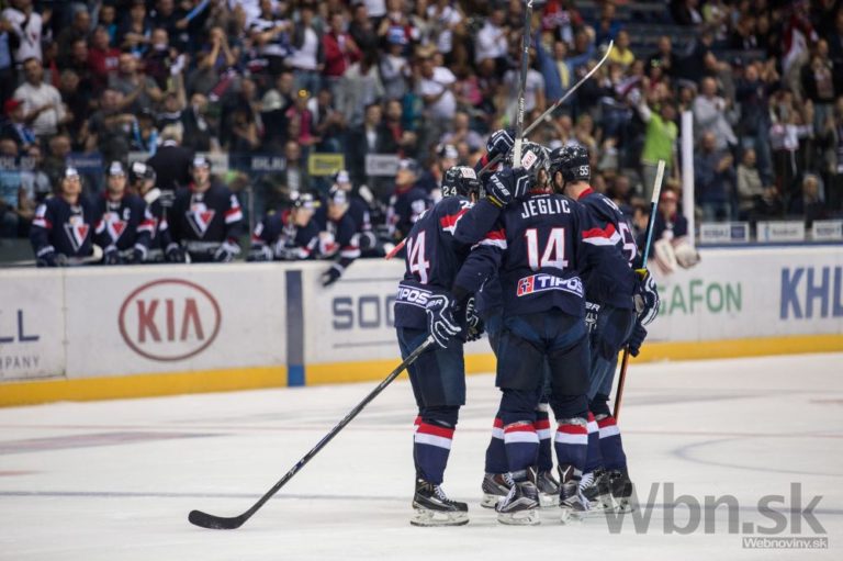 Hráči Slovana sa radujú z prvého golu v zápase Kontinentálnej hokejovej ligy (KHL) medzi HC Slovan Bratislava - Medveščak Záhreb. Bratislava, 6. september 2015. Foto: SITA/Marko Erd