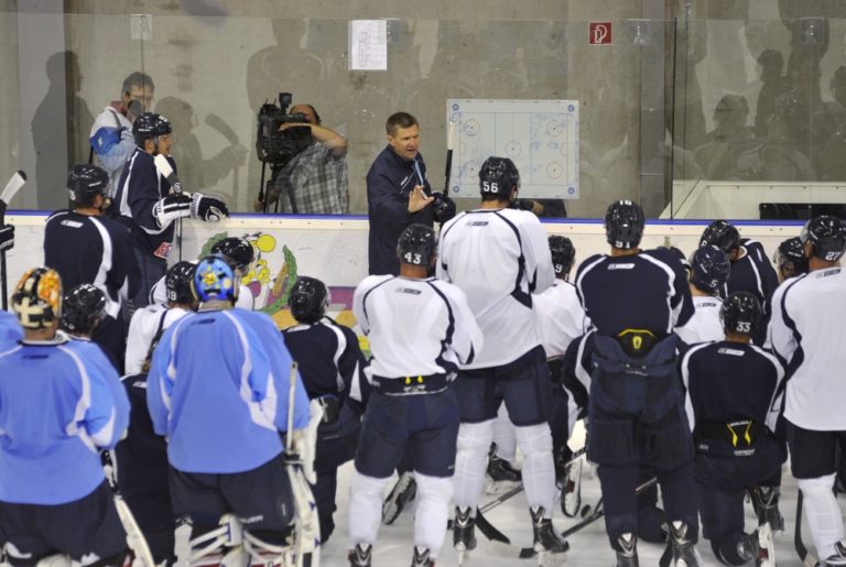 Zľava: Mário Lunter a asistent trénera Vladimír Országh počas prvého tréningu HC Slovan Bratislava pred novou sezónou. Bratislava, 11. júl 2014 Foto: SITA/Ján Slovák