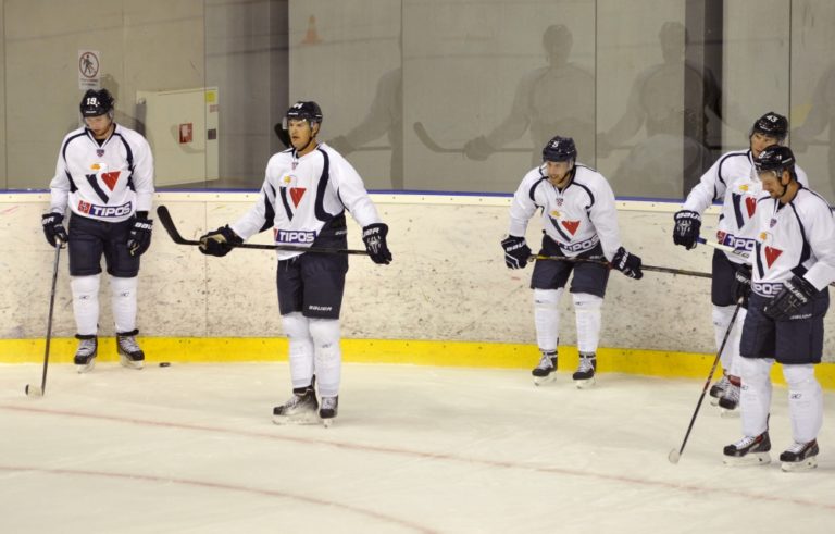 Zľava: Patrick White, Rok Tičar a Tomáš Surový počas prvého tréningu HC Slovan Bratislava pred novou sezónou. Bratislava, 11. júl 2014 Foto: SITA/Ján Slovák