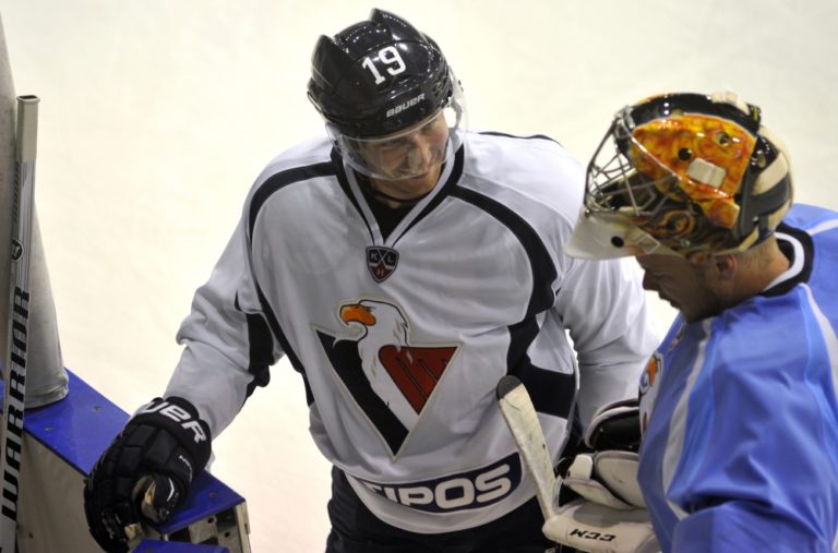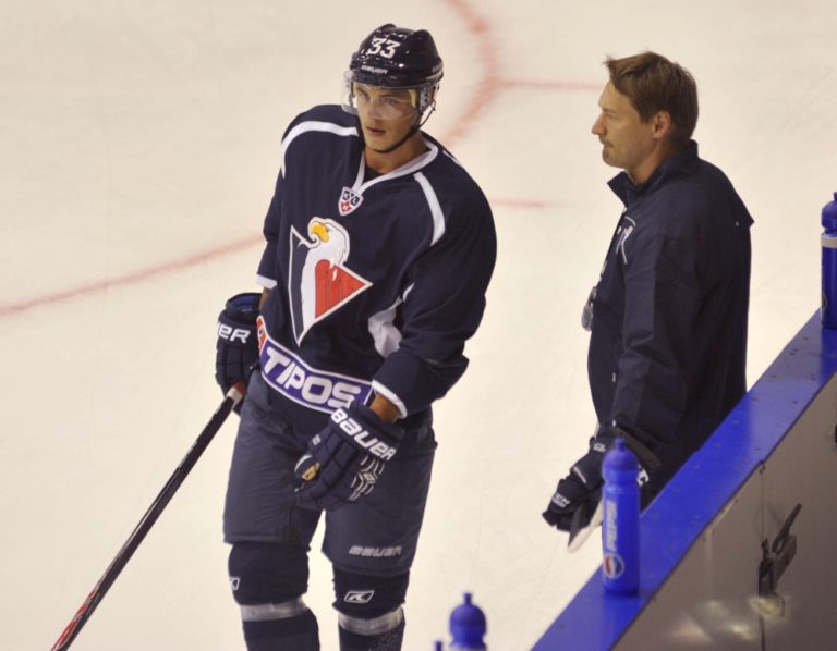 Zľava: Matt Murley a brankár Johan Backlund počas prvého tréningu HC Slovan Bratislava pred novou sezónou. Bratislava, 11. júl 2014 Foto: SITA/Ján Slovák