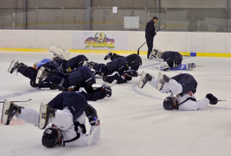 Hráči HC Slovan Bratislava počas prvého tréningu pred novou sezónou. Vzadu uprostred tréner Rostislav Čada. Bratislava, 11. júl 2014 Foto: SITA/Ján Slovák