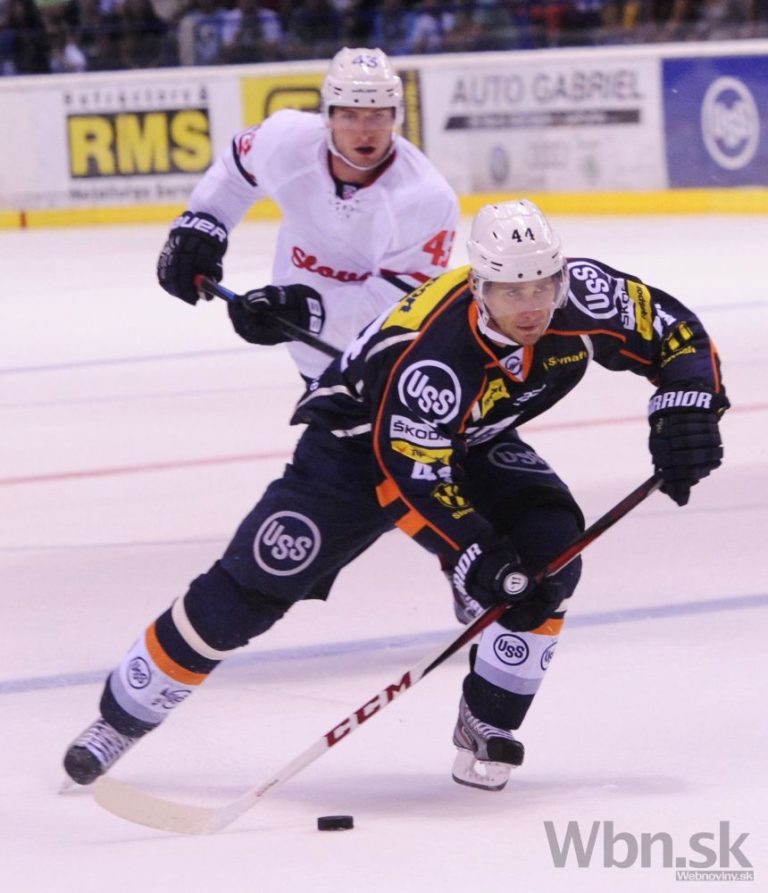 Zľava: Tomáš Surový z Bratislavy a Gabriel Spilar z Košíc v prípravnom zápase HC Košice - Slovan Bratislava. Košice, 6. august 2014. Foto: SITA/Ivan Fleischer