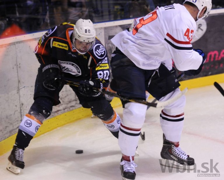 Zľava: Martin Štajnoch z Bratislavy a Milan Kolena z Košíc v prípravnom zápase HC Košice - Slovan Bratislava. Košice, 6. august 2014. Foto: SITA/Ivan Fleischer