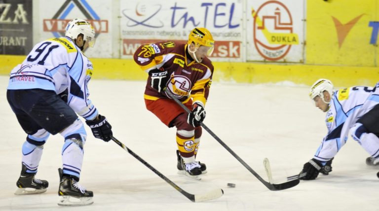 Zľava: Richard Lelkeš z HK Nitra, Branislav Jánoš z Dukly Trenčín a Michal Novák z HK Nitra počas hokejového zápasu 52. kola Tipsport extraligy medzi Dukla Trenčín a HK Nitra. Trenčín, 28. február 2014. Foto: SITA/Tomáš Somr