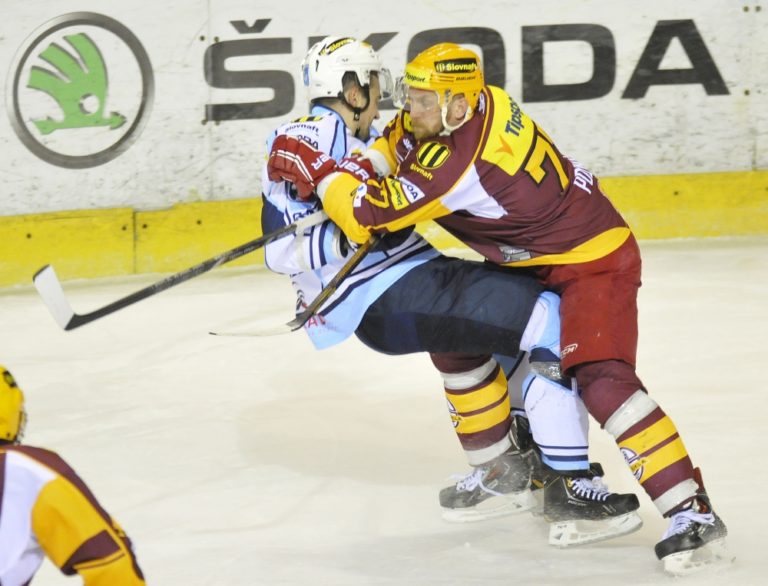 Sprava: Anton Pozník a Adam Nagy z Dukly Trenčín počas hokejového zápasu 52. kola Tipsport extraligy medzi Dukla Trenčín a HK Nitra. Trenčín, 28. február 2014. Foto: SITA/Tomáš Somr