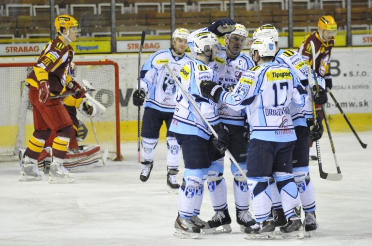 Hráči HK Nitra sa radujú z gólu počas hokejového zápasu 52. kola Tipsport extraligy medzi Dukla Trenčín a HK Nitra. Trenčín, 28. február 2014. Foto: SITA/Tomáš Somr