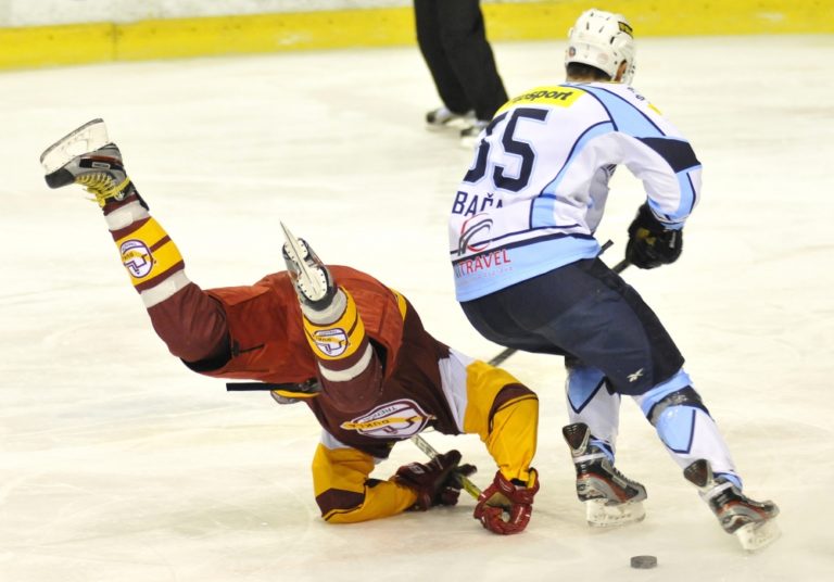 Zľava: Tomáš Troliga z Dukly Trenčín a Martin Bača z HK Nitra počas hokejového zápasu 52. kola Tipsport extraligy medzi Dukla Trenčín a HK Nitra. Trenčín, 28. február 2014. Foto: SITA/Tomáš Somr