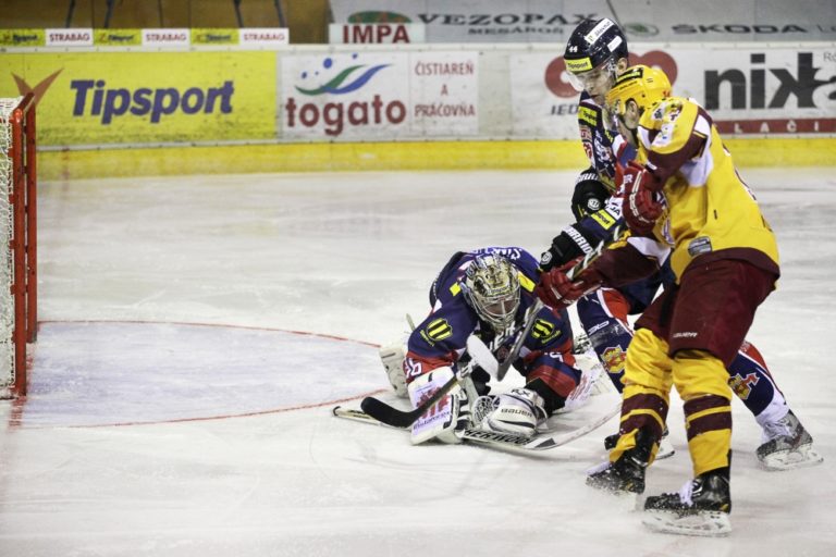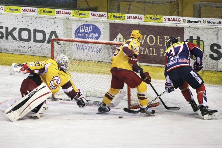 Kirill Safronov (vpravo) z HKM Zvolen a Anton Pozník (druhý zľava) z HK Dukla Trenčín počas 49. kola slovenskej hokejovej Tipsport extreligy 2013/2014 medzi HKM Zvolen - HK Dukla Trenčín. Zvolen, 14. február 2014. Foto: SITA/Ján Viazanička