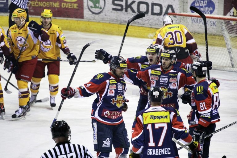 Radosť hráčov HKM Zvolen po strelení prvého gólu počas 49. kola slovenskej hokejovej Tipsport extreligy 2013/2014 medzi HKM Zvolen - HK Dukla Trenčín. Zvolen, 14. február 2014. Foto: SITA/Ján Viazanička