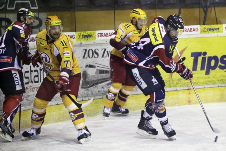 Milan Jurík (vpravo) z HKM Zvolen a Róbert Slipčenko (vľavo) z HK Dukla Trenčín počas 49. kola slovenskej hokejovej Tipsport extreligy 2013/2014 medzi HKM Zvolen - HK Dukla Trenčín. Zvolen, 14. február 2014. Foto: SITA/Ján Viazanička