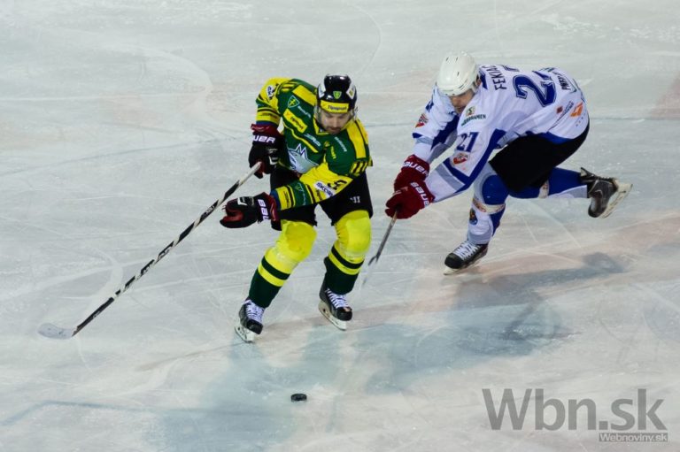 Zľava: Ján Šmiko (MsHK DOXXbet Žilina) a Patrik Fekiač (HC 07 Orin Detva) počas zápasu slovenskej hokejovej Tipsport extraligy 2014/2015 medzi MsHK DOXXbet Žilina a HC 07 Orin Detva. Žilina, 12. marec 2014. Foto: SITA/Milo Fabian