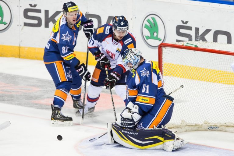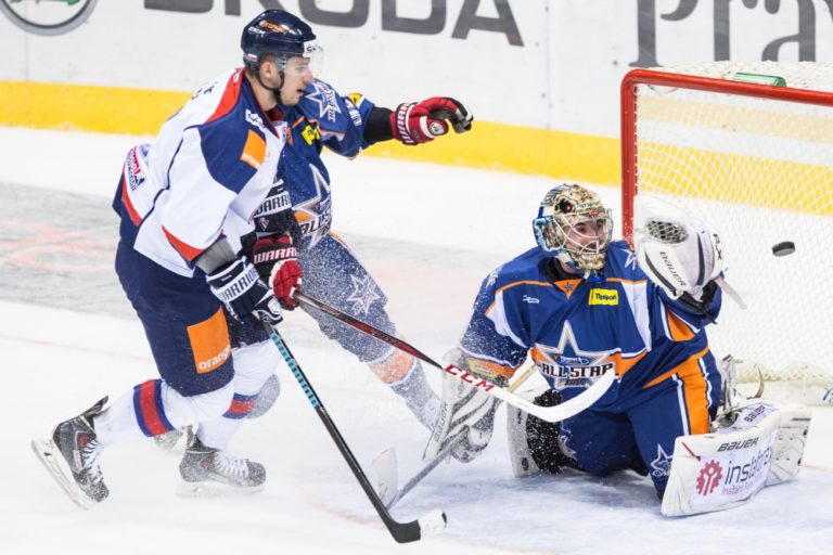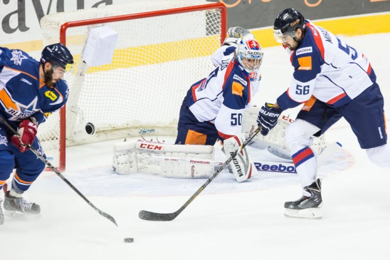 Zľava: Hráč Olympijského výberu SR Martin Bakoš a brankár výberu Tipsport extraligy Marek Šimko počas prípravného zápasu medzi Olympijským výberom SR a výberom Tipsport extraligy. Bratislava, 3. február 2014. Foto: SITA/Jozef Jakubčo