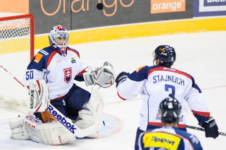 Zľava: Hráč Olympijského výberu SR Martin Štajnoch a brankár Olympijského výberu SR Ján Laco počas prípravného zápasu medzi Olympijským výberom SR a výberom Tipsport extraligy. Bratislava, 3. február 2014. Foto: SITA/Jozef Jakubčo