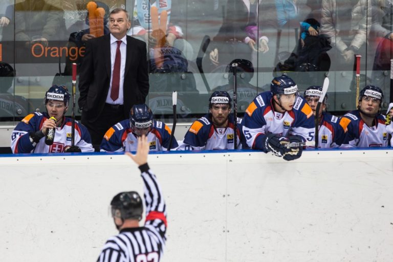 Tréner Olympijského výberu SR Vladimír Vůjtek (druhý zľava) počas prípravného zápasu medzi Olympijským výberom SR a výberom Tipsport extraligy. Bratislava, 3. február 2014. Foto: SITA/Jozef Jakubčo