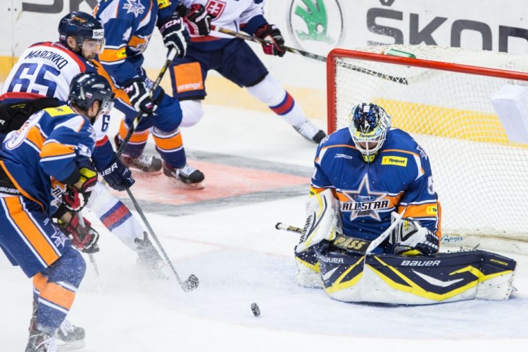 Hráč Olympijského výberu SR Milan Bartovič počas prípravného zápasu medzi Olympijským výberom SR a výberom Tipsport extraligy. Bratislava, 3. február 2014. Foto: SITA/Jozef Jakubčo