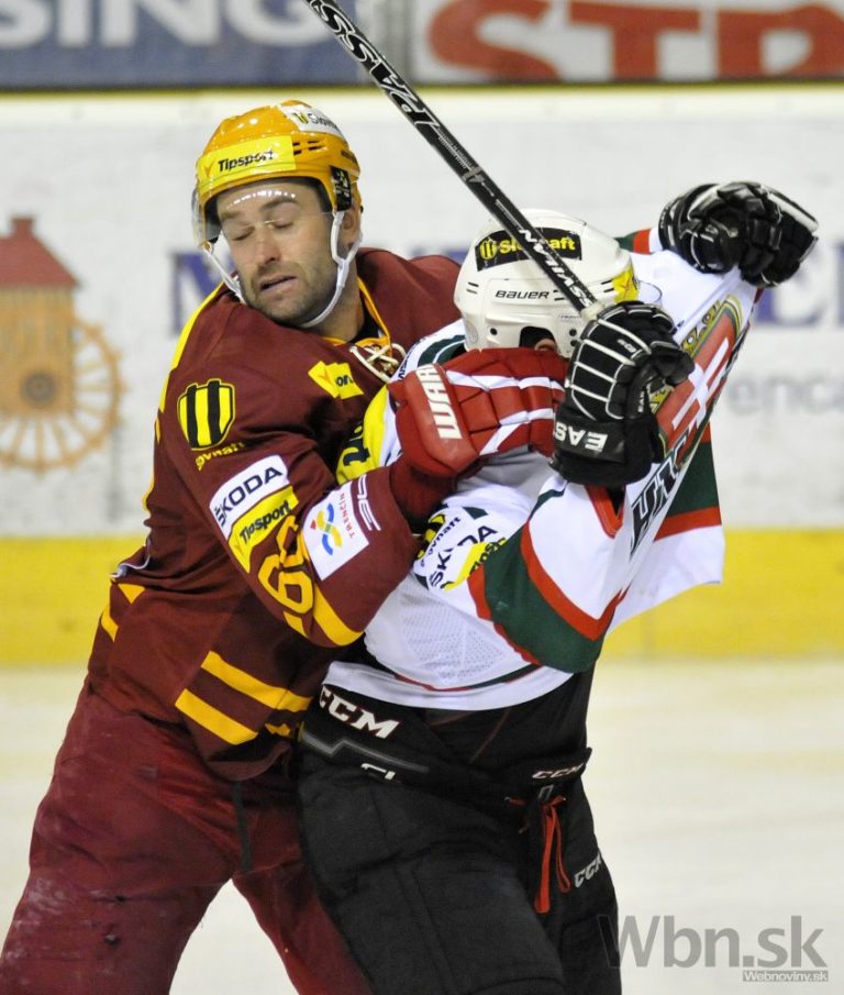 Sprava: Tomaž Razingar z Dukly Trenčín a Peter Horváth z HK 36 Skalica počas 39. kola hokejovej Tipsport extraligy medzi Dukla Trenčín a HK 36 Skalica. Trenčín, 9. január 2015. Foto: SITA/Tomáš Somr