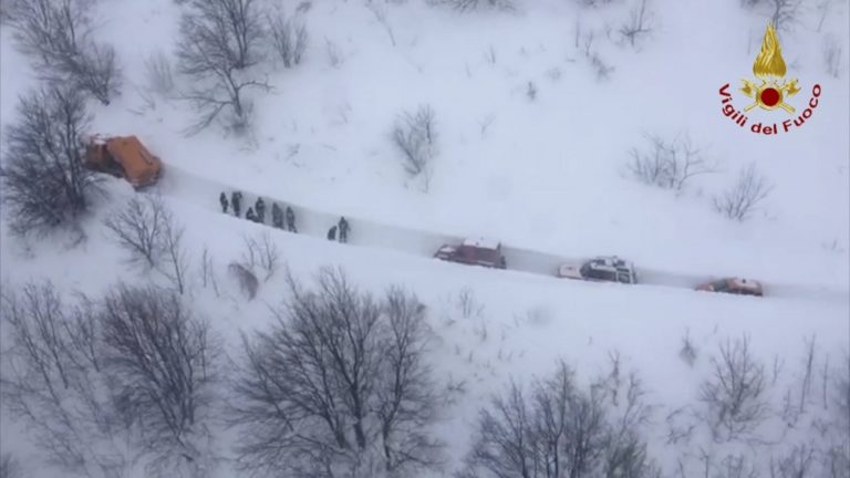 Záchranárske vozidlá na ceste k zasypanému hotelu. 19. január 2017. Foto: SITA/AP