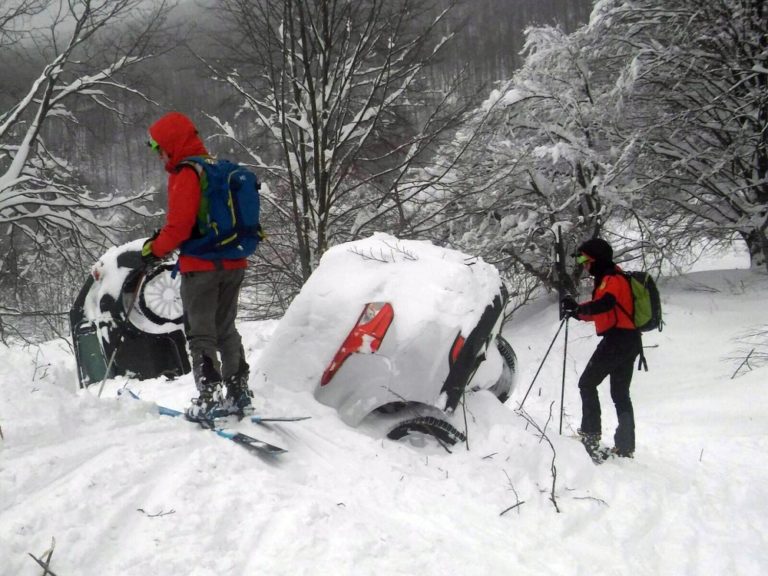 Záchranári na lyžiach nad zasypanými autami pred hotelom. 19. január 2017. Foto: SITA/AP