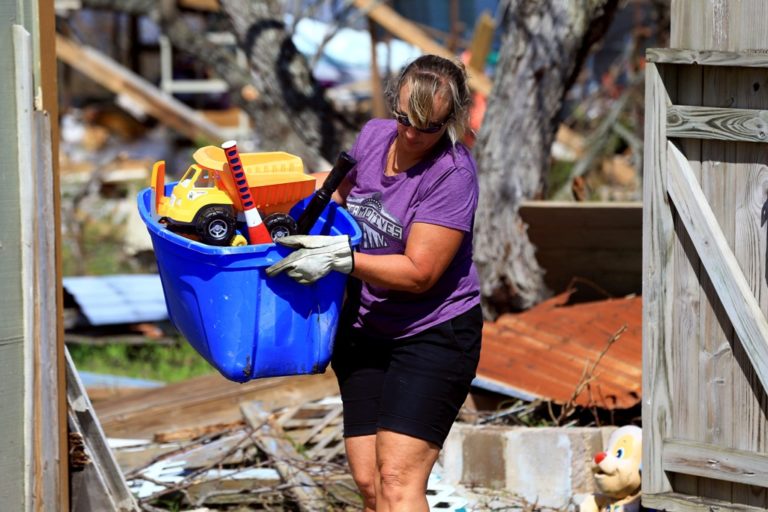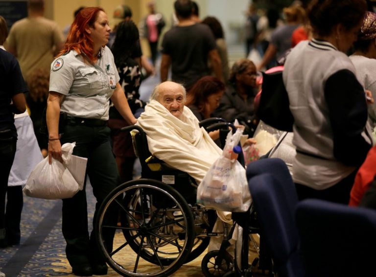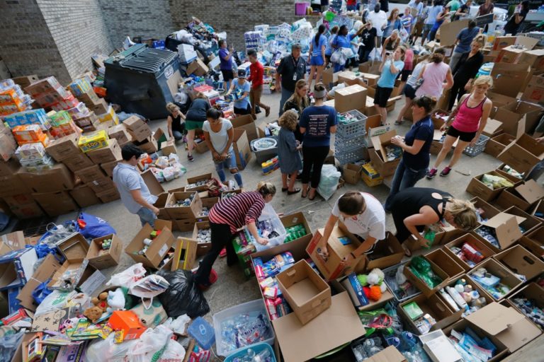 Dobrovoľníci pomáhajú ľuďom, postihnutým hurikánom Harvey, ktorý spôsobil zničujúce záplavy v meste Houston. V centrách dostanú najmä stravu a šatstvo. Foto: SITA/AP.