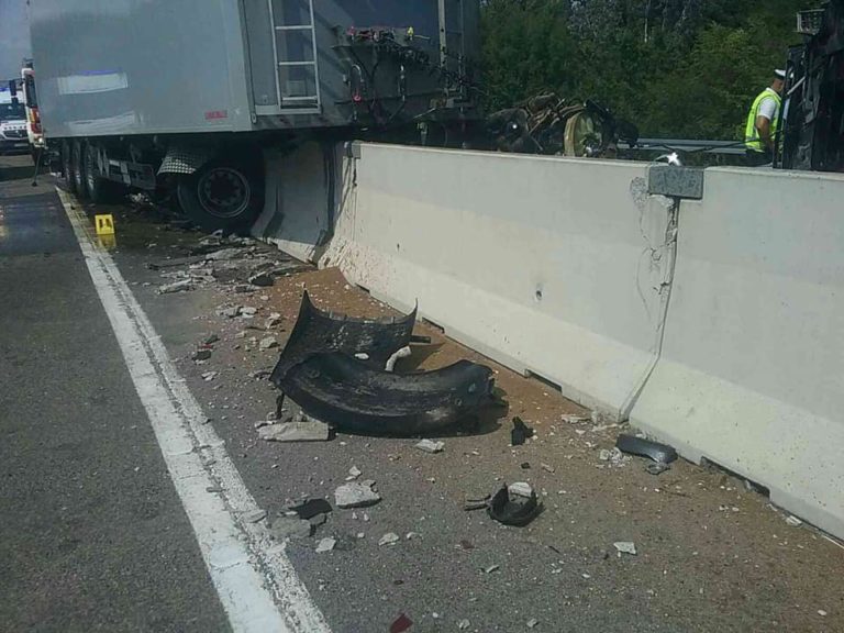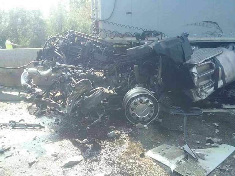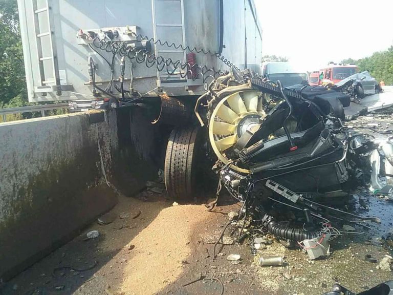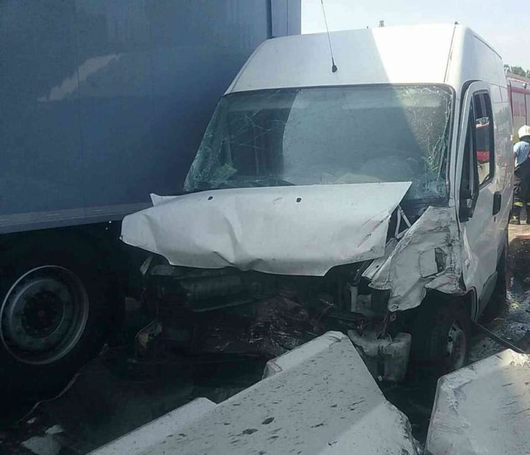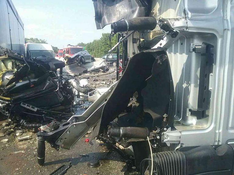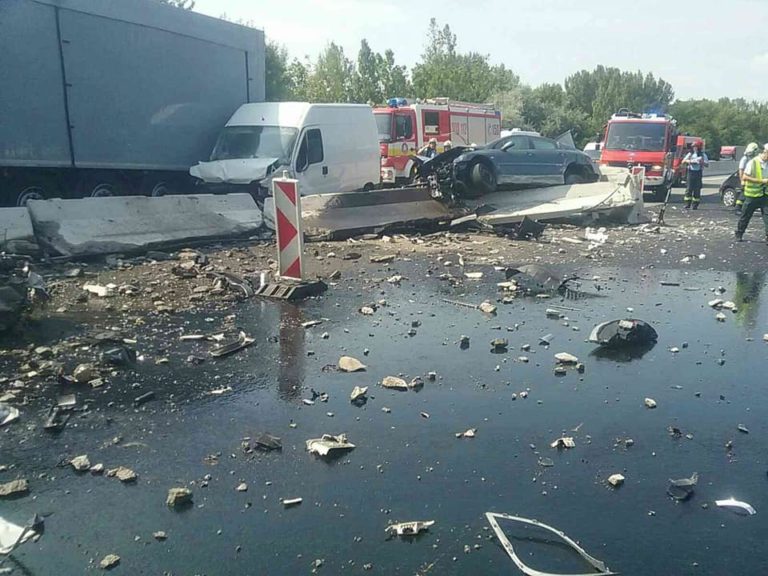 Hasiči zasahovali pri vážnej dopravnej nehode, ktorá sa stala na 64,5 kilometri diaľnice D1 v smere na Hlohovec v katastri obce Červeník. Pri nehode sa zrazil kamión s dodávkou a dvomi osobnými autami. Kamión po náraze prerazil stredové zvodidlá a skončil v protismere. 29. júl 2019 Foto: HaZZ