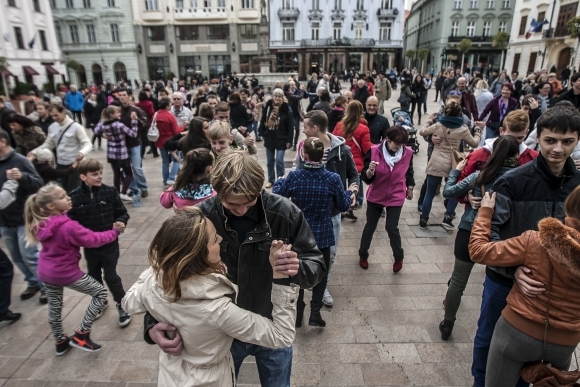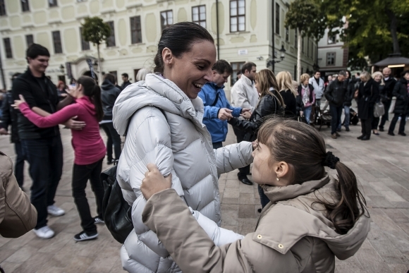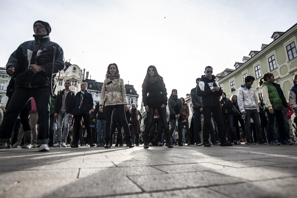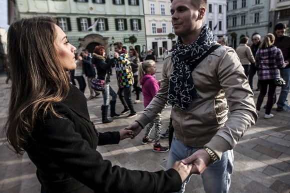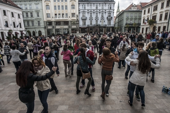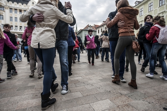 Pokus o ustanovujúci slovenský rekord v hromadnom tancovaní ča-ča na Hlavnom námestí. Foto: SITA/Gabriel Kuchta