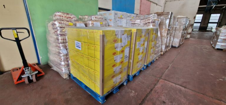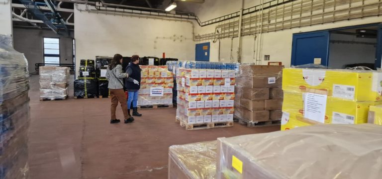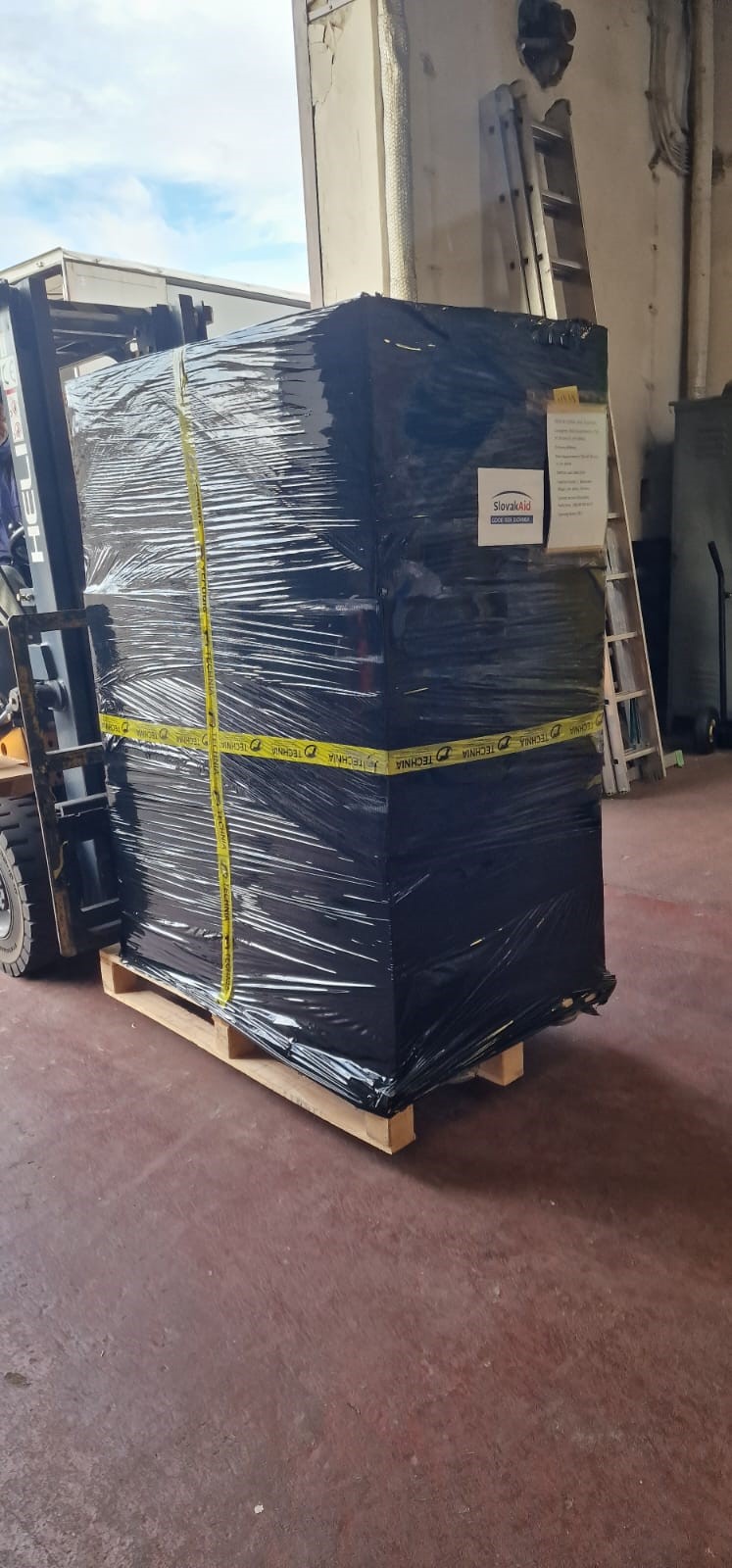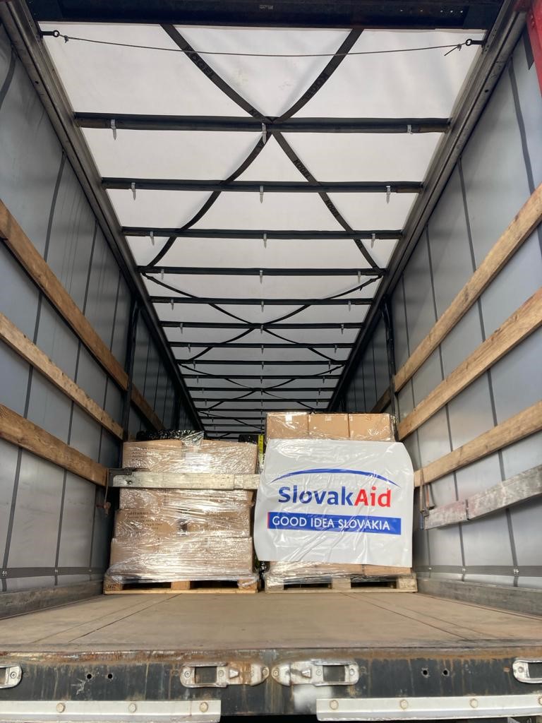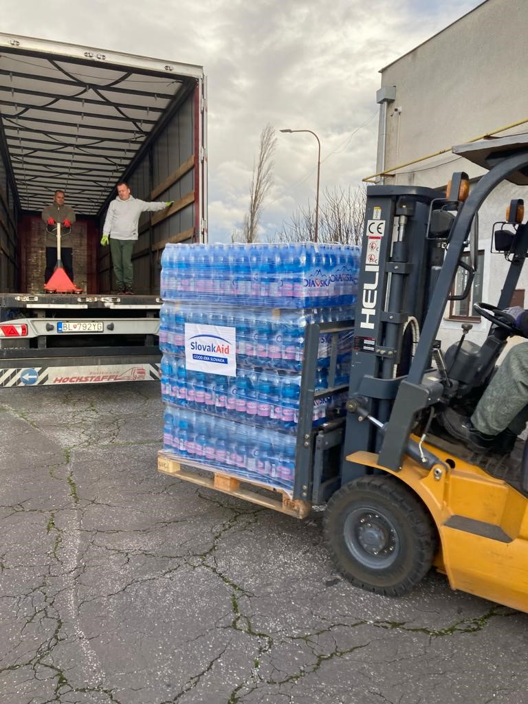 Humanitárna pomoc pre Ukrajinu s hmotnosťou 21 ton, ktorej obsahom sú elektrocentrály, ohrievače, oblečenie a lekárničky zo zásob Ústredia ekumenickej pastoračnej služby v Ozbrojených silách SR a ozbrojených zboroch SR. Potraviny, balenú vodu a oblečenie sú zo zásob Ministerstva vnútra SR. Na zabezpečovaní humanitárnej pomoci sa podieľa aj Ministerstvo zahraničných vecí a európskych záležitostí SR. Bratislava, 4. január 2024. Foto: SITA/MV SR