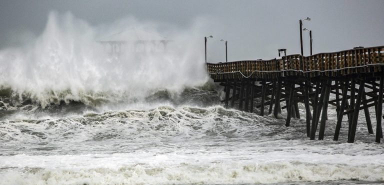 Vlny pri móle na Kill Devil Hills v Severnej Karolíne počas hurikánu Florence. 14. september 2018 Foto: SITA/AP