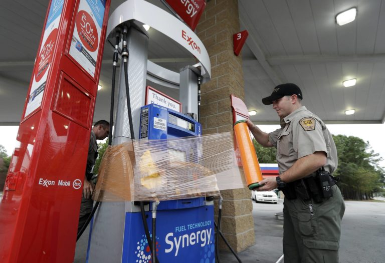 Polícia v meste Wilmington, Severná Karolína, obaľujú čerpaciu stanicu, aby ju ochránili pred vodou a vetrom z hurikánu Florence. 14. september 2018 Foto: SITA/AP