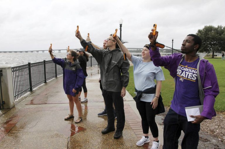 Študenti merajú silu vetra hurikánu Florence v New Bern v Severnej Karolíne. 14. september 2018 Foto: SITA/AP