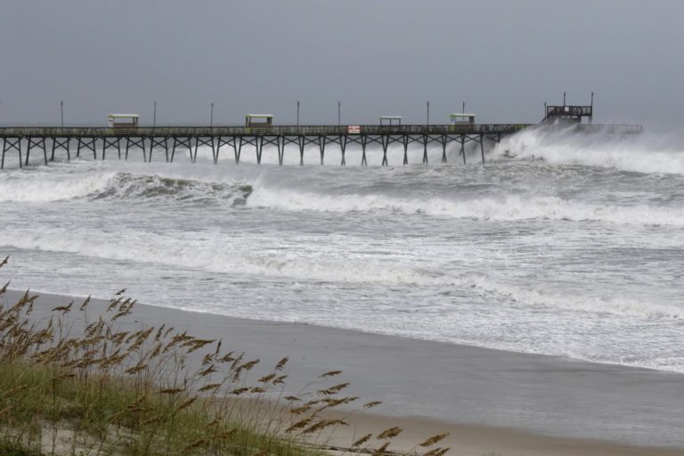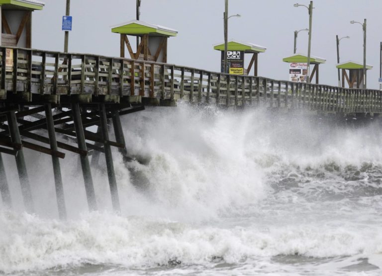 Na mólo v Atlantic Beach, v Severnej Karolíne narážajú vlny, ktoré tam pritiahol hurikán Florence. 14. september 2018 Foto: SITA/AP