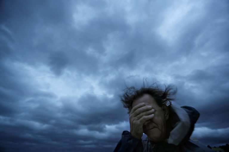 Russ Lewis si zakrýva oči pred silným vetrom a pieskom na Myrtle Beach zasiahnutom hurikánom Florence. 14. september 2018 Foto: SITA/AP