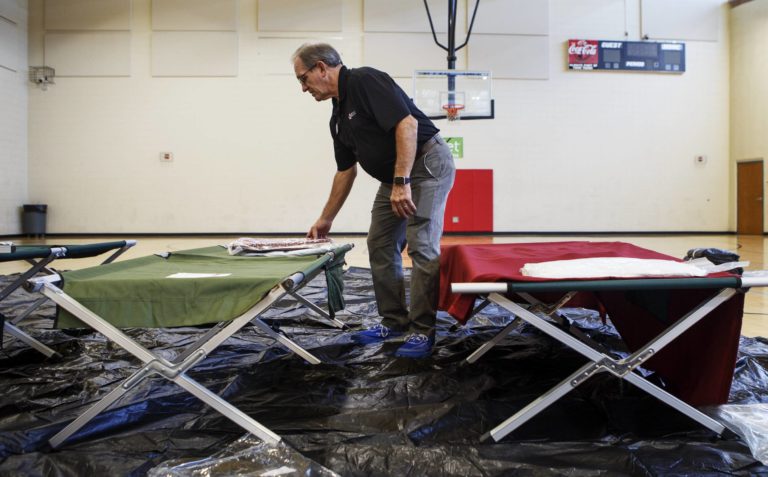 Zamestnanec Červeného kríža v Chattanooga v Tennesee, ktorý pripravuje dočasné prístrešie pre Američanov počas hurikánu Florence. 14. september 2018 Foto: SITA/AP